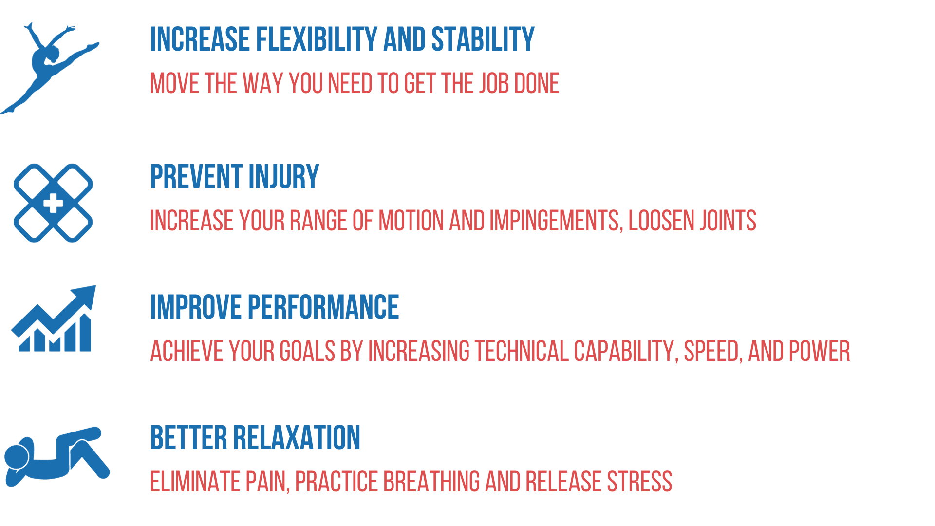 Athletes can benefit from Assisted Stretching as it increases flexibility, reduces soreness, and relieves tension while quieting the mind to aid in peak performance. Assisted Stretching has been known to help sufferers of chronic muscle or joint pain, headaches, and stress. Everyone can benefit from relieving muscular tension, improving circulation, boosting the immune system, and balancing the body energetically.